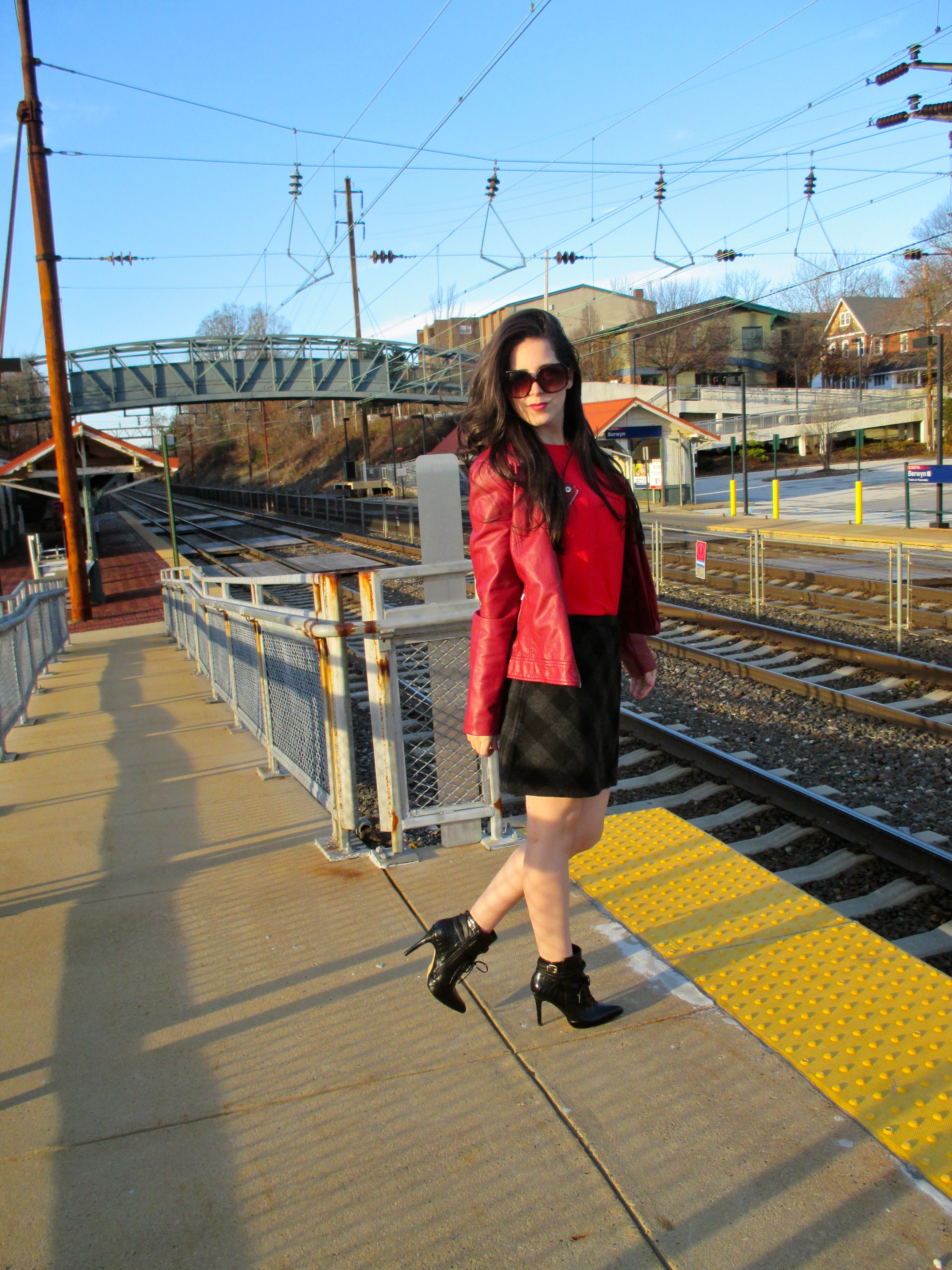 Wearing: Blouse (J.Crew), Skirt (C. Wonder), Jacket (Forever 21, similar), Sunglasses (Steve Madden), Shoes (Altuzarra), Lipstick (Givenchy)